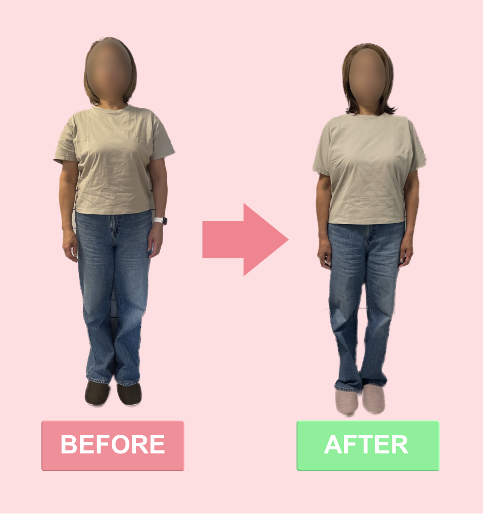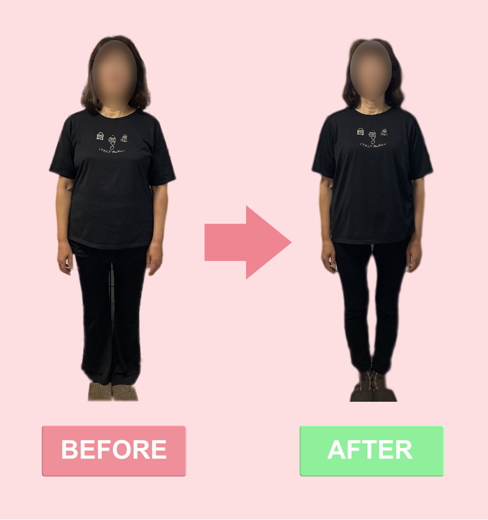 太ってしまい似合わなくなったり、はけなくなったパンツもすっきりはけてシルエットが太る前に戻り、不安だった血圧も170台から110台まで下がり健康不安が無くなり嬉しい事尽くしです。