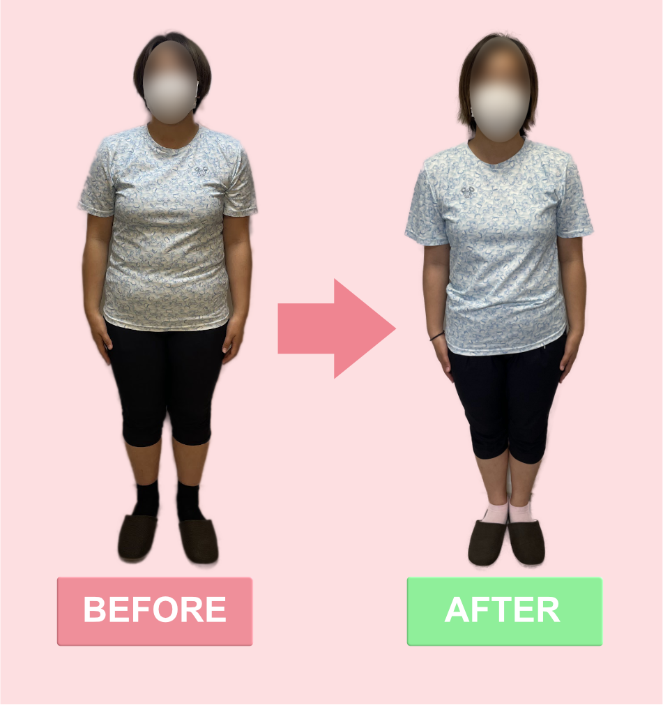 ストレスによる過食で太ってしまい困っていたのでダイエットを決意。3ヶ月でー10kg、減量するのは正直無理だと思っていましたが、先生のサポートで達成することができました。本当に感謝しています。食事の量が減っても、最近は調子良く過ごせています。これからも過食はできるだけせずに、健康な体を維持していきたいです。