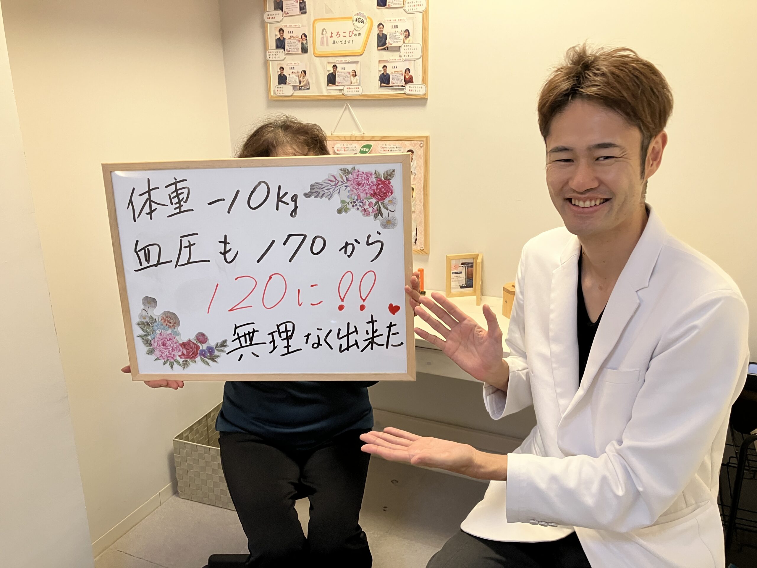 我流では時間と努力を掛けたつもりでも成果はなかなか出ませんが、信じて施術を相談して実践すると体重血圧だけでなく心も軽くなり気持ちが明るくなります。いつになっても好きな服を着られる事は生き甲斐にもなり前向きな気持ちになります。